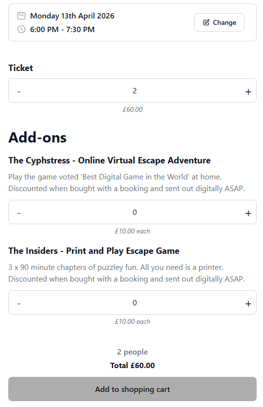 While we’re on the subject of the checkout experience, why stop at the room itself? A great booking system will let you offer upsells and merchandise directly at the point of booking. Whether that’s encouraging players to add on a second room, adding drinks or food on the day, pre-ordering a t-shirt, or a digital game to play whenever they like. You can even sell merchandise without a booking attached, so your play-at-home escape rooms and branded products can generate revenue around the clock without being dependent on room availability.